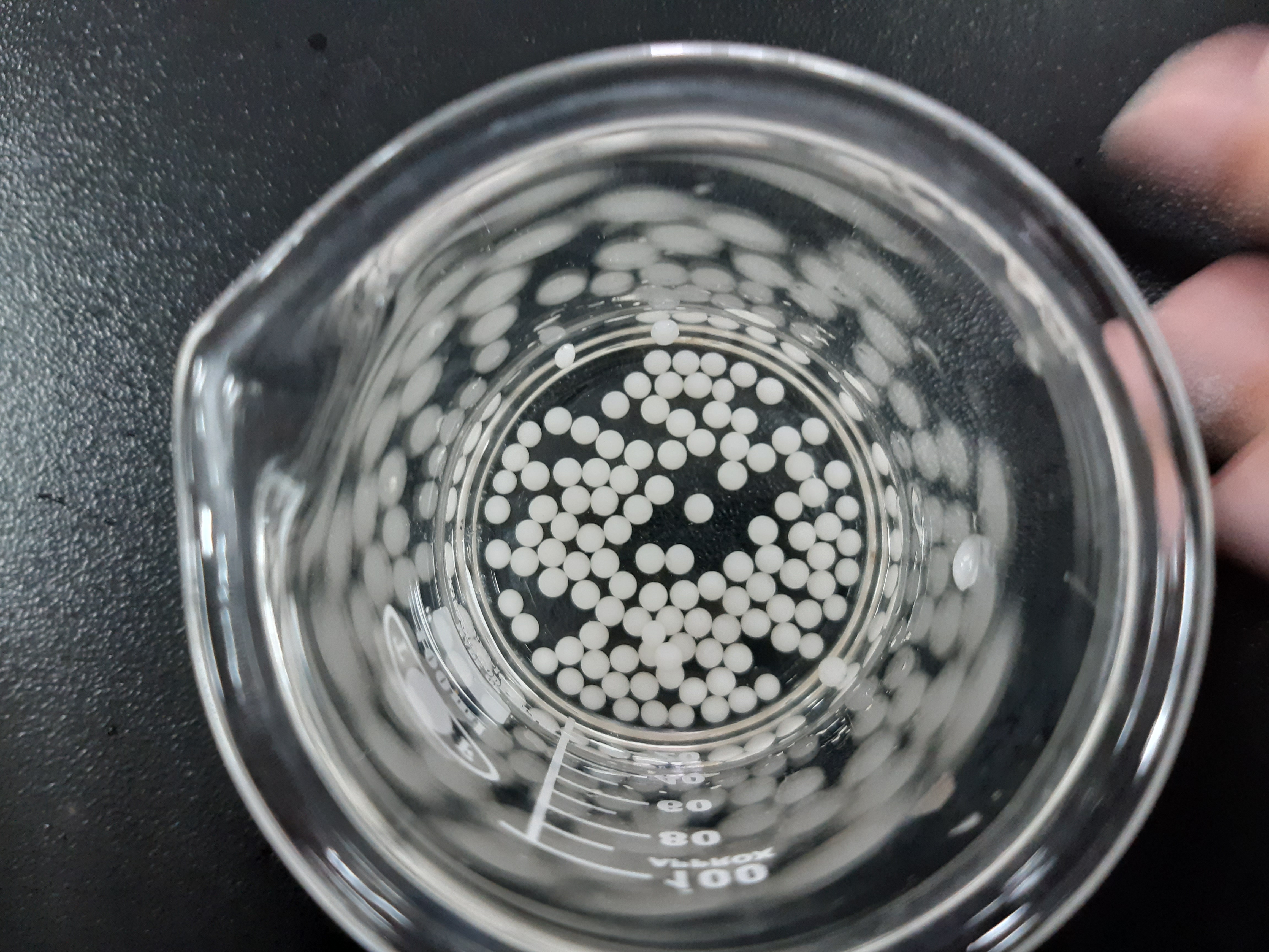 - 將酵母水溶液倒入海藻酸鈉水溶液中並吸取 2ml 以針筒滴入氯化鈣水溶液中。
