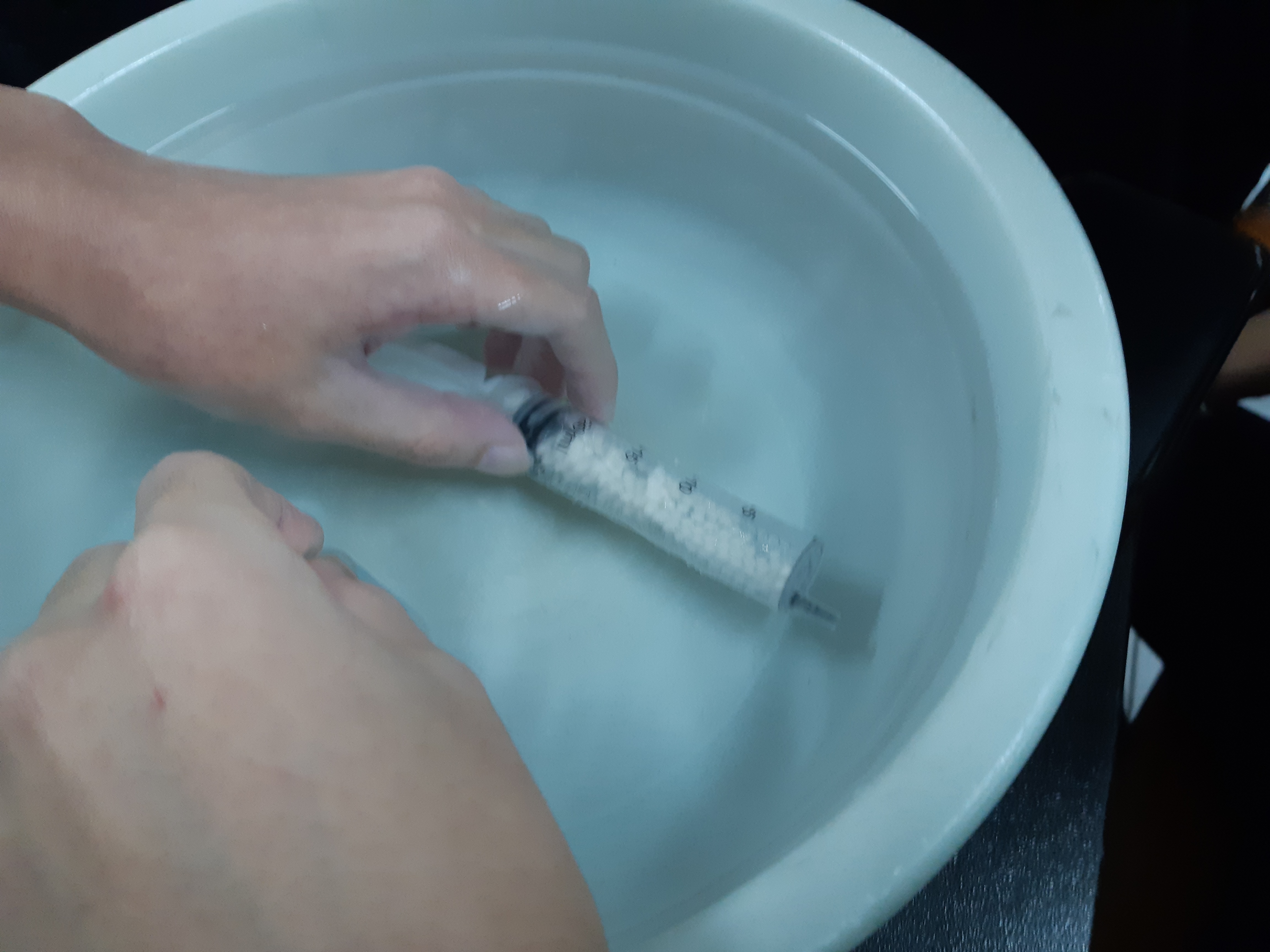 - 用紗布濾出生成在氯化鈣水溶液中的小球並放入針筒中。